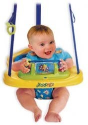 Recomiendo especialmente los saltadores con bandeja como el Jump & Go de BBY pues evita posibles golpes con el marco de la puerta, sobre todo si hay un hermanito mayor que columpia al bebé, como sucede en casa.