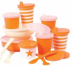 Es ideal para familias con dos niños pues cuenta con cuatro vasos con tapa y pico para beber, dos bowls con tapa, dos tenedores, dos cucharas y dos tazas pequeñas, también con tapas fundamental para evitar derrames.