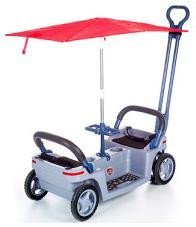 Tiene dos asientos con sus respectivos cinturones de seguridad, los respaldos están reforzados, posee unas fuertes ruedas que no hacen ruido y que se amolda a cualquier tipo de terreno, además son direccionales. Cuenta también con una sombrilla plegable y regulable para protegerles del sol o de las primeras gotas de lluvia si te pilla en la calle.