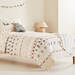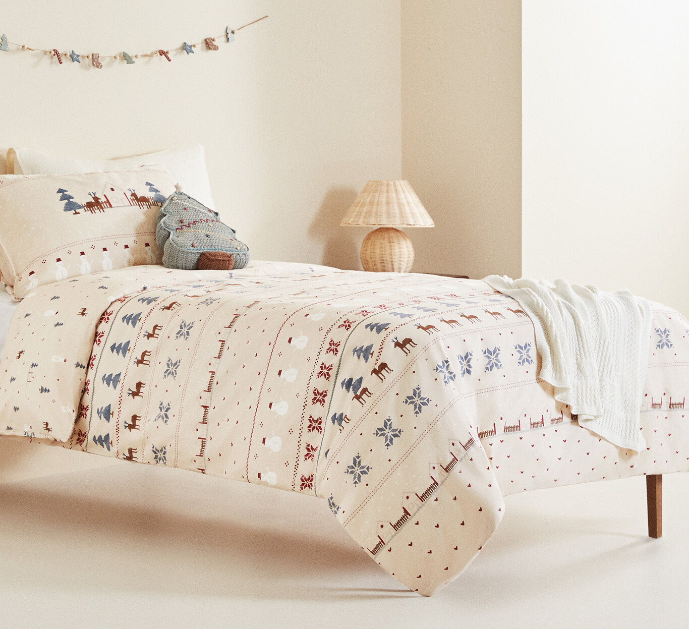 Funda nórdica infantil con estampados invernales de abetos, muñecos de nieve y ciervos y detalle de cintas bordadas. Tiene un cierre con botones ocultos en la parte inferior, excepto para la medida de 100x120 cm que cierra con solapa interior oculta. Su precio es de 39,99 euros.