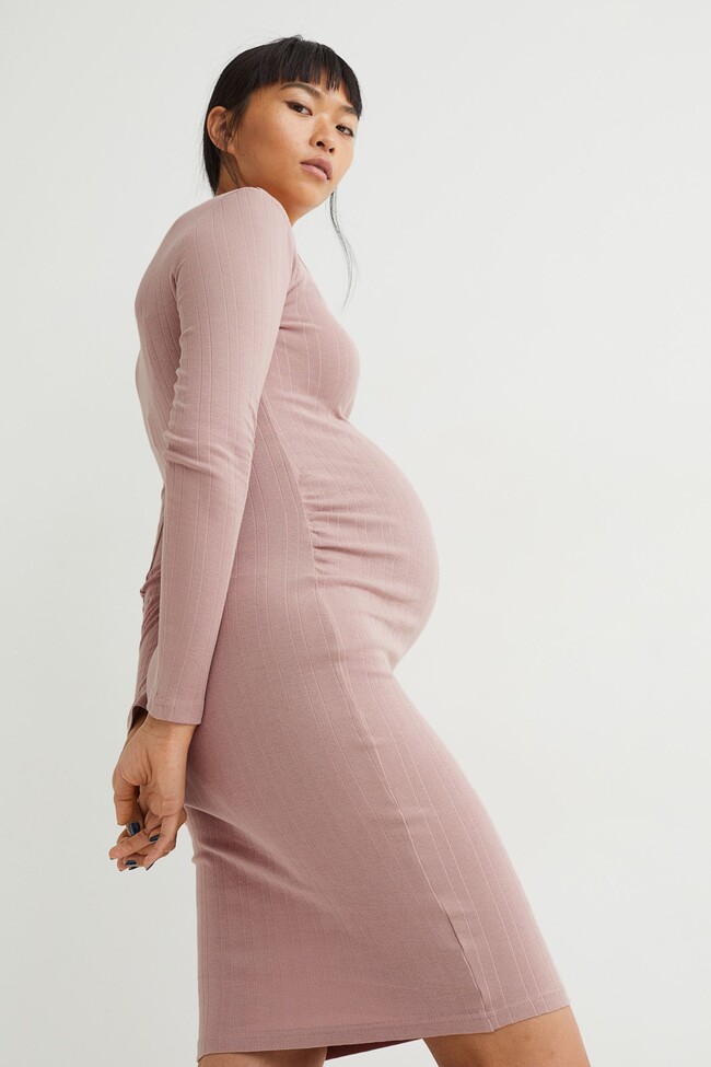 Vestido de punto de canalé gris con abertura en la falda de Seraphine y apto para la lactancia. Su precio es de 39 euros.
