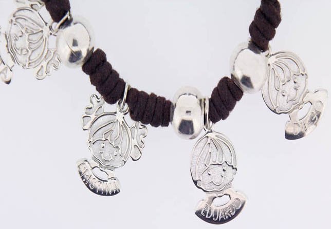 Están confeccionadas en cordón de cuatro colores a elegir (rosa, marrón chocolate, negro y rojo) con cuatro bolitas plateadas en bisutería y el charm en forma de caritas de niños y niñas en plata de ley 925. Cada pulsera se realiza a pedido y se personaliza con las caritas y los nombres de los hijos.