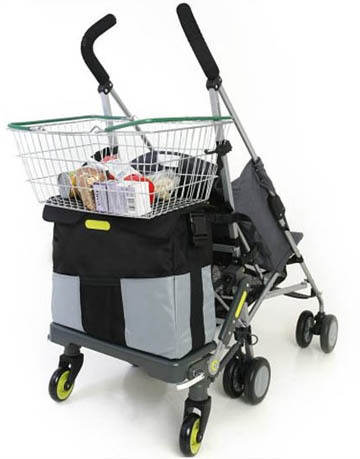 Por medio de un sencillo montaje podemos convertir al carrito del bebé en un carrito de la compra. La cesta de la compra queda fija a la altura adecuada para que podamos recorrer el supermercado con nuestro bebé en su propio carrito sin tener que colocarlo necesariamente en el asiento del carro de la compra.