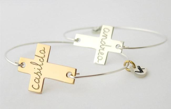 Unas de las más elegantes son las cruces con el nombre del niño o la niña grabado, que también pueden ser preciosas como regalo de Comunión. Tenéis varios modelos, hay unas pulseras de cordón con cruces grabadas también ideales. Yo me pondría tres, cada una con el nombre de una de mis hijas.