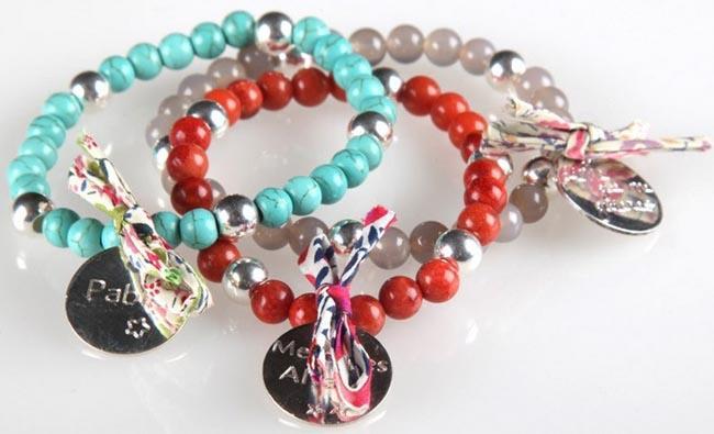 Son pulseras de piedras semipreciosas como ágata, turquesa y coral combinadas con bolitas de plata que incorporan medallas con el nombre del niño.
