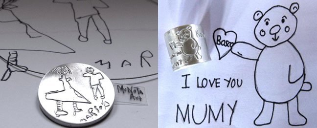 La línea “Art by KIDS” de Munota es una colección de anillos, colgantes, llaveros, broches en la que se plasman los dibujos elaborados por los niños. Los más pequeños son los diseñadores. Realizan un dibujo y se elige la pieza de plata en la que queremos que quede grabado.