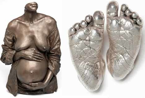 Pueden hacer una escultura de tu cuerpo con tripa de embarazada o perfectas réplicas de los pies o manos de tu bebé convertidas en pisapapeles, un adorno, un pin o hasta gemelos para la camisa de papá.