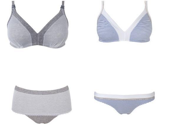 Se trata de la línea "Lencería & Maternal", con sujetadores de lactancia en tonos suaves, grises o estampado en rayas azul marino, que se pueden combinar con bragas que tienen la zona de la barriga reforzada para mayor sujección. Los materiales son de algodón combinados con lycra y están disponibles en varias tallas.