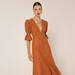 Vestido camisero de tejido calado y manga corta fruncida en color teja de Cherubina. Su precio era de 190 euros y ahora es de 133 euros.