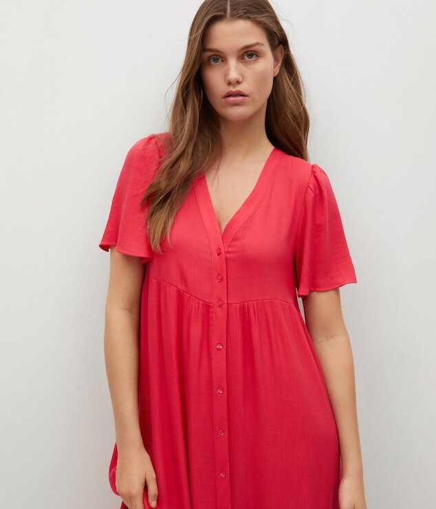 Maxi vestido camisero fucsia de manga corta y corte amplio. Su precio es de 39,99 euros.