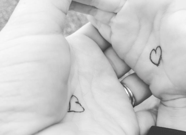 Le dibujé un corazón en cada mano y le hice otro de repuesto en el brazo, en caso de que los de las manos se desgastaran. Iba "cargado" de camino a la escuela y cuando lo recogí le pregunté si había recibido mis abrazos, ¡y él felizmente dijo que sí!. También dijo: "Lo presioné durante mucho tiempo, pero no lloré". Entonces le dije: "Ahhhh... eso habrá sido el gran apretón que sentí, ¿recibiste de vuelta el mío?" Y él dijo "sí".