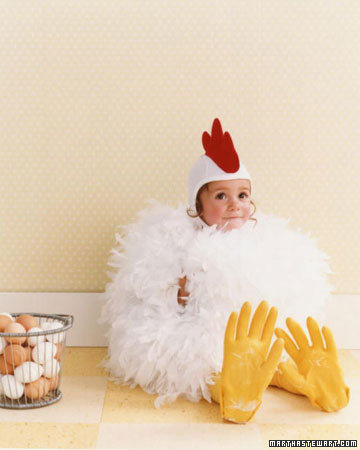 Martha Stewart es uno de mis sitios de manualidades preferido. Nos ofrecen ideas de muy buen gusto, originales y fáciles de hacer. Podemos encontrar disfraces tan bonitos como el de pollito que ilustra el post. Parece complicado pero no lo es. Sólo necesitamos dos boas de plumas blancas, unos guantes de cocina para las patas, un gorro de baño y una cresta hecha con fieltro. ¿No es genial?