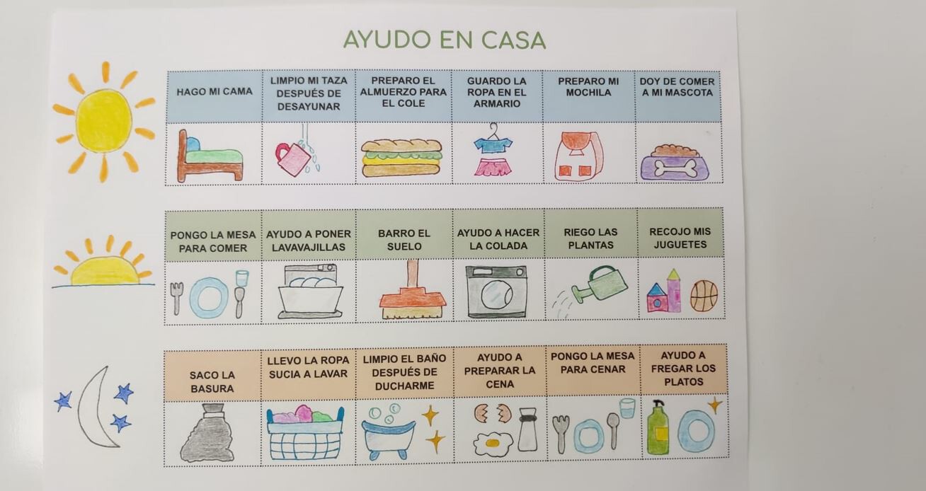 Recomendamos que en la elaboración de la tabla participen los niños, bien sea dibujando, escribiendo el nombre de las tareas o coloreando los dibujos. También podéis idear un sistema de tachado de tareas una vez se vayan completando.