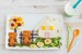 Picar la fruta en trozos menudos e ir organizando con ellos la forma de un árbol, colocar los palitos de pan o galleta haciendo el tronco y una valla. Poner un Osito LULU en el paisaje.