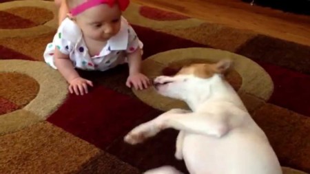 Claro que no le enseña a gatear, sino que quiere jugar con él adoptando una posición parecida a la suya. Se pone a su altura y repta por el suelo, al igual que el bebé. Pero sin saberlo, con esos sencillos gestos, el perro está estimulando los movimientos necesarios para que el bebé comience a gatear.