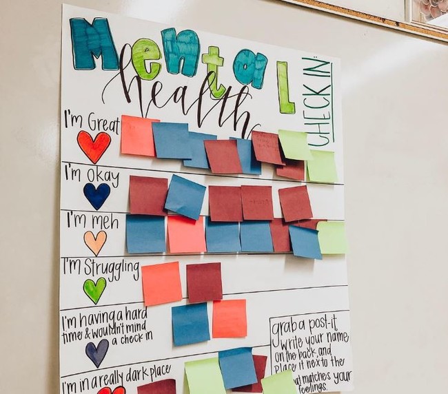 A través de una fotografía en su cuenta de Instagram, Erin muestra la tabla de "revisión de salud mental" que colocó en su salón de clases, en la que invita a sus alumnos a que compartan de forma anónima cómo se han sentido últimamente.