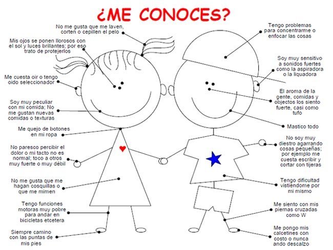 Además de los síntomas que véis en el dibujo de arriba, se puede sospechar que el niño tiene un procesamiento sensorial anómalo si: