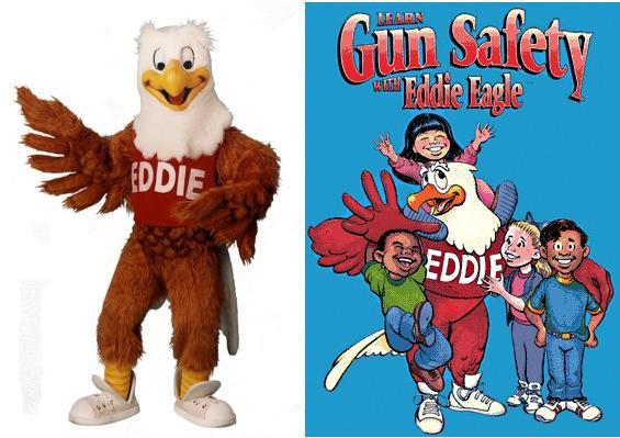 "Eddie Eagle" o el Águila Eddie es el nombre de la mascota que visita a los niños en los colegios de Estados Unidos para prevenir los peligros que supone que hasta un 45% de los hogares (53 millones de casas) guarden armas y un 34% de los adultos posean una pistola.