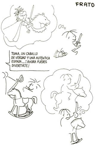 Volvemos a utilizar una viñeta de Francesco Tonucci para mostrar una realidad que parecemos haber olvidado, precisamente, los que de pequeños más uso hacíamos de la imaginación, que el mejor juguete no siempre se paga, sino que vive en nosotros.