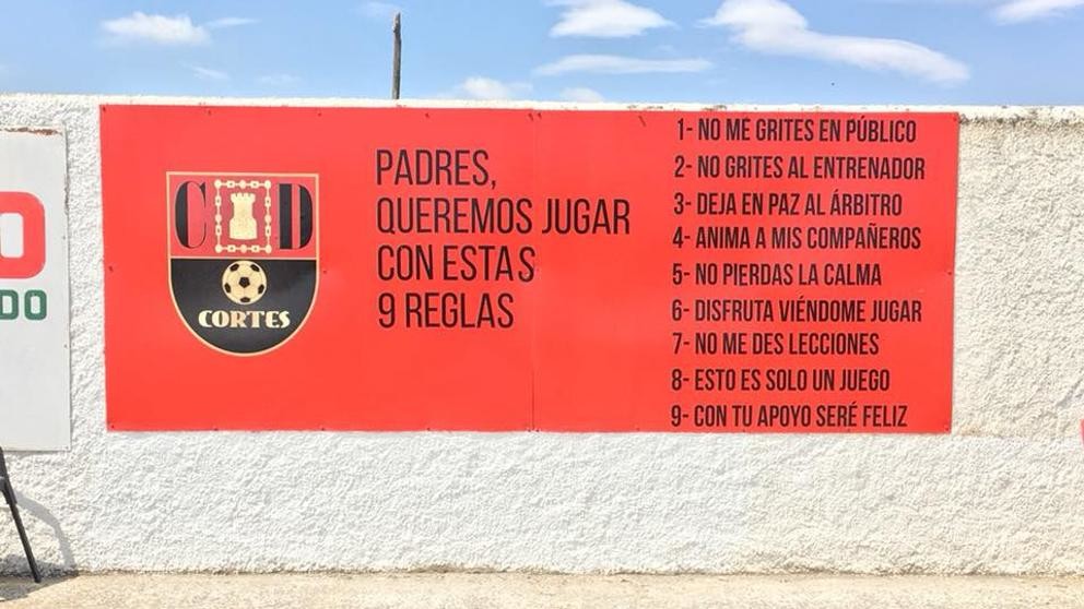 En el campo luce un enorme cartel que detalla las nueve reglas que tienen que cumplir los padres que asisten como espectadores a los partidos de sus hijos, entre las que se encuentran "no gritar al entrenador" o entender que "esto es un juego".