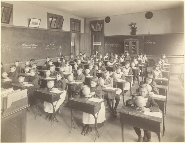 1892. En una escuela en Boston, Estados Unidos, los alumnos de sexto grado (11 y 12 años) estudian pequeños globos terráqueos durante clase.