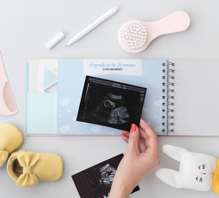 Con este álbum de fotos podrás rememorar los 9 meses de embarazo con todo el detalle que quieras. Desde la primera ecografía y los antojos, hasta los nombres que tenías pensados hasta encontrar el perfecto y cómo no, podrás pegar fotos de cómo va creciendo tu barriguita mes a mes.