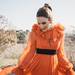 Impresionante vestido largo vaporoso plisado en color naranja. Una creación perfecta para una boda de tarde-noche con detalle de volantes en las mangas y cuello, combinado con un cinturón lazo negro de Juana Rique. Su precio es a partir de 900 euros.