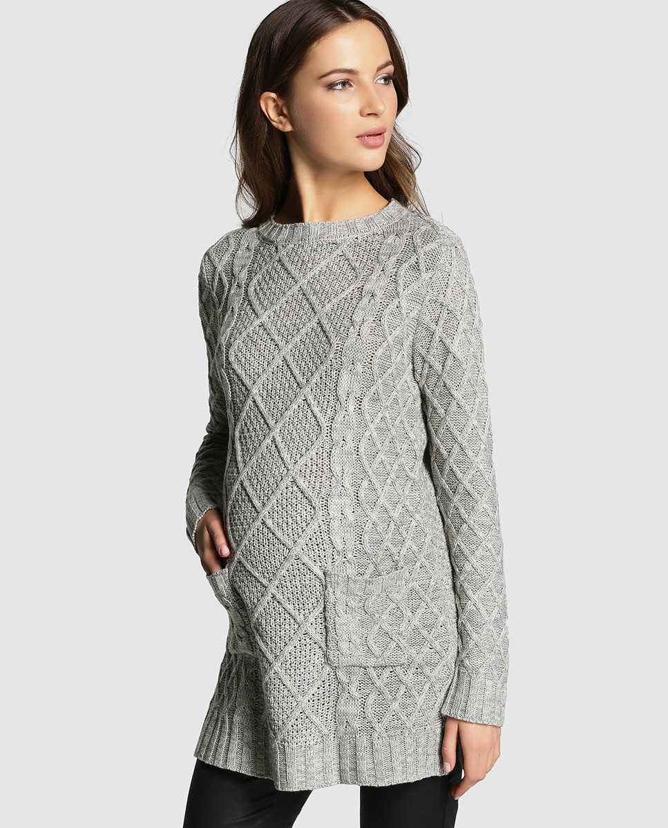 Jersey largo en color gris con trabajo de ochos delanteros, cuello redondo, cortes laterales, bolsillos delanteros y canalé en los puños y el bajo de Alía, por 29,95 euros. Este tipo de jersey lo podrás llevar con unos leggings o unos pantalones ajustados.