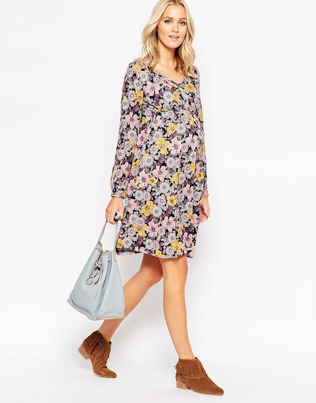 Vestido de tejido elástico en estampado floral de diferentes colores, mangas largas con aberturas y escote cruzado de Bluebelle Maternity, por 33,99 euros. Se adapta a las diferentes fases del embarazo.