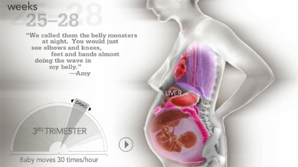 El embarazo tiene un notable impacto en el cuerpo de la madre, tanto físico como psicológico. Hoy os quiero enseñar un gráfico interactivo realizado por el Museo de Ciencias e Industria de Chicago que aunque no es nuevo, es el que mejor nos enseña cómo se desplazan los órganos de la madre en el embarazo para dejar lugar el bebé.