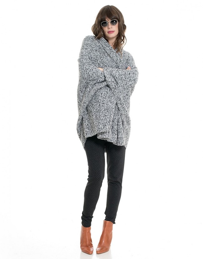 Si quieres dar un toque diferente a tus looks opta por un cárdigan de punto grueso jaspeado en negro y blanco, con diseño envolvente y estilo kimono. Las chaquetas estilo kimono son tendencia total y quedan ideales con unos vaqueros o una falda tubo. De Mit Mat Mamá, por 95 euros.