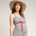 Para ir a la playa o para tomar algo en una terraza al lado del mar apuesta por un maxi vestido (sirve para el embarazado y para lactancia) de estilo marinero con punto elástico. Es un vestido con estampado de rayas en azul marino y negro con corte imperio con cinturón trenzado de color rojo. Lleva tirantes finos que se pueden ajustar y un bustier integrado en la parte delantera para dar el pecho con facilidad. De Esprit, por 79,99 euros.