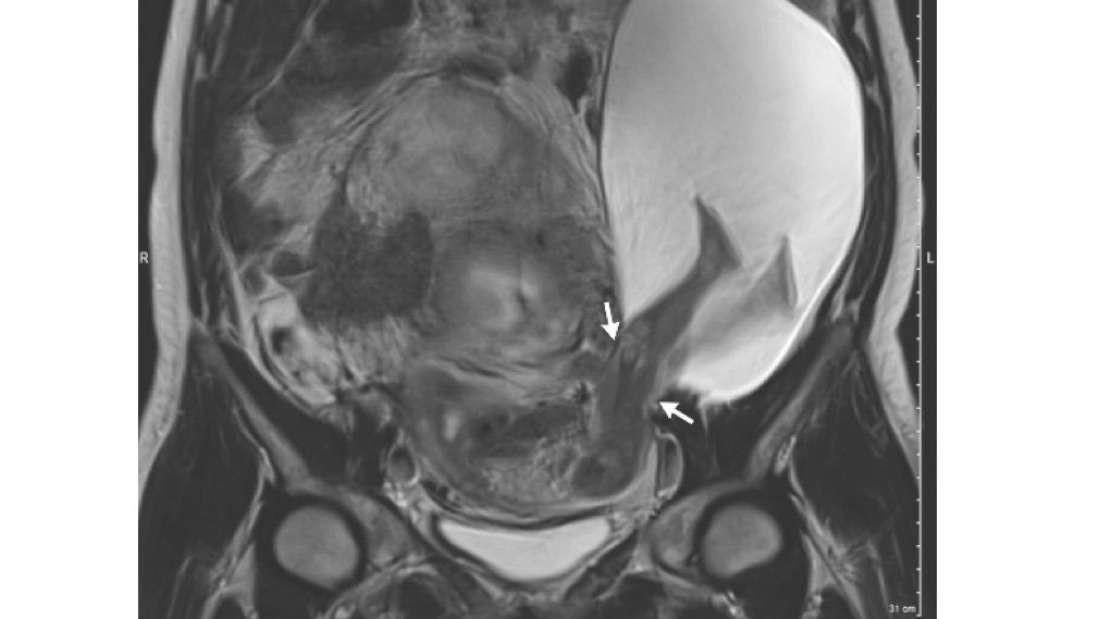 O al menos fue entonces cuando lo vieron. En la semana 22 se realizó una ecografía de rutina y vieron que algo no iba bien. Entonces le hicieron una resonancia magnética que reveló lo que veis en la imagen de arriba: las piernas del bebé habían salido del útero, y con ellas parte del saco y del líquido amniótico. La apertura medía unos 2,5 cm y a través de ella se habían colado sus piernas y las otras estructuras.