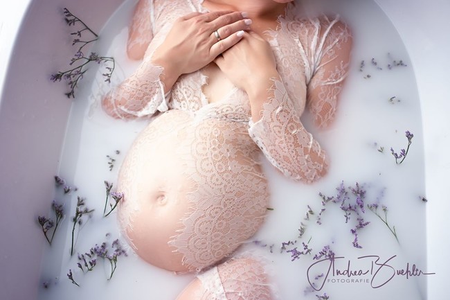 Los baños de leche son una nueva tendencia en fotografía que encanta a las embarazadas y la verdad es que los resultados son realmente preciosos. No es necesario que sea leche, se le puede añadir colorante al agua y añadirle flores o frutas.