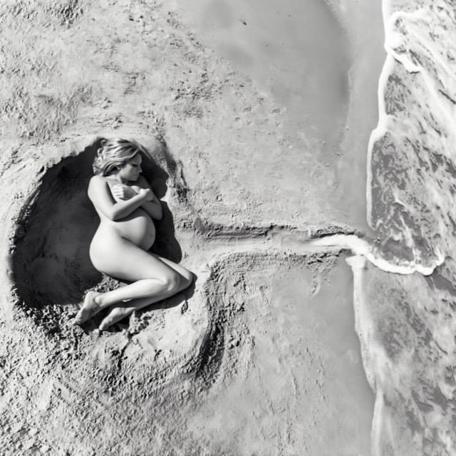 Cuanto más la miro, más me gusta esta imagen. Por lo bonita que es, por lo potente, por la Naturaleza, y por supuesto por lo que transmite con tan pocos elementos, sin artificios. Una embarazada desnuda, tumbada en la arena de la playa en posición fetal conectada con el mar. Solo eso y tanto como eso. Pura poesía.