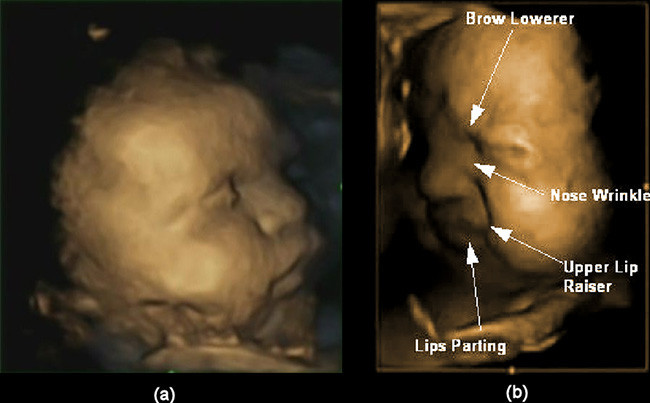 Un estudio realizado con estas ecografías muestra que los bebés hacen en el útero diversas muecas de dolor, expresiones de disgusto, que son las mismas que realizan después de nacer cuando están disconformes con algo o cuando sienten dolor. Según dicen los investigadores, podría ser un ensayo para prepararse para los padecimientos en la vida externa y para lograr hacerlo saber a sus cuidadores, o sea, a sus padres.