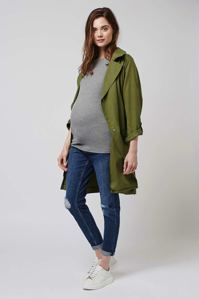 Es fundamental que en tu armario primaveral tengas una chaqueta de entretiempo. Elige un modelo de estilo clásico, pero con toques modernos como este abrigo/gabardina en color kaki con bolsillos delanteros, manga francesa y cinturón de Topshop Maternity, por 110 euros.