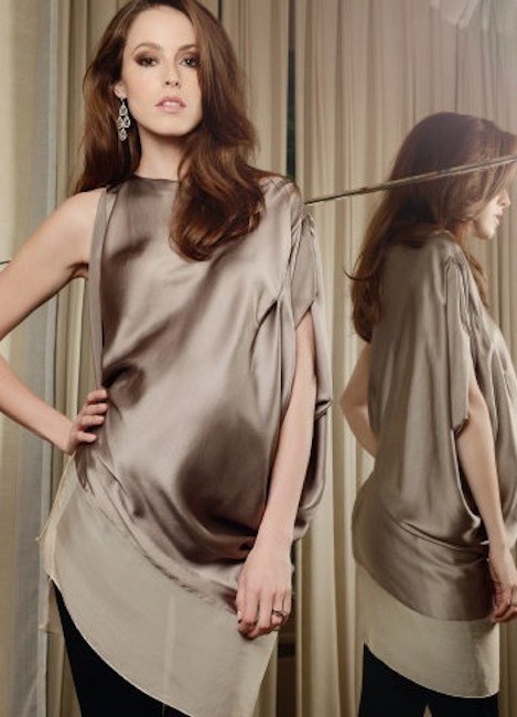 Túnica de raso de seda en color bronze o taupe de Seraphine, por 69 euros. Las túnicas siempre quedan mucho mejor con pantalones y si pueden ser estilo pitillo mucho mejor. Nos estilizarán la figura.