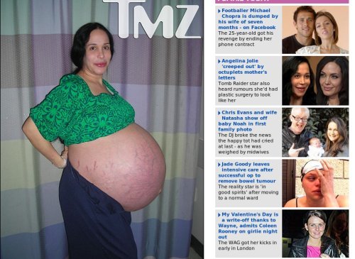 El diario británico Daily Mail ha publicado, en su versión online, dos fotos que muestran a Nadya Suleman, de 33 años, ocho días antes que diera a luz en California, Estados Unidos. Impresionante...