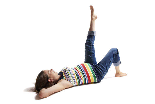Acostada de lado con la pierna apoyada flexionada, eleva y baja la pierna que queda en la parte superior varias veces, descansando y cambiando de lado.