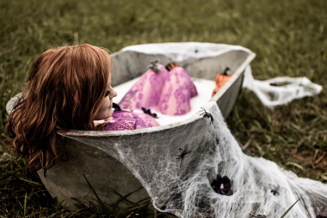 Tampoco podía faltar una bañera antigua y un baño de leche (que en realidad es agua teñida) para que la sesión fuera perfecta. El resultado son las fotografías que os enseñamos a continuación y que a nosotros nos han encantado aunque sean "de terror".