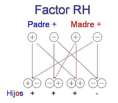 La herencia del Rh se compone de dos genes, uno se hereda de la madre y el otro del padre y sigue un patrón común. El gen Rh positivo es dominante, es decir que incluso cuando se combina con un gen Rh negativo, el positivo prevalece.