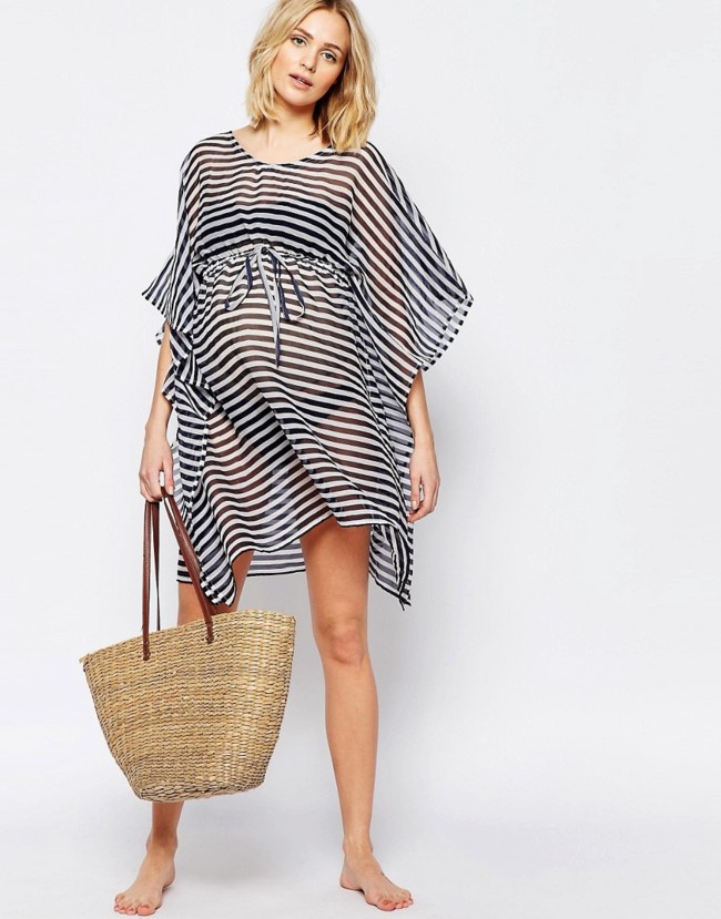 Vestido estilo caftán para la playa o la piscina con estampado de rayas en negro y blanco, tejido semitransparent, escote redondo, corte imperio con cordón ajustable de Mama.Licious, por 31,99 euros. Ideal para combinar con un bañador o bikini en negro.