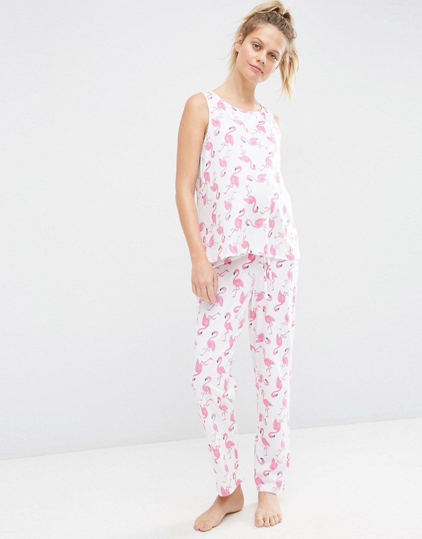 Pijama con pantalón largo con cintura con cordón ajustable, camiseta sin mangas con escote redondo, en algodón y con estampado de flamencos en color rosa. De Asos Maternity, por 27,99 euros. Un pijama muy divertido.