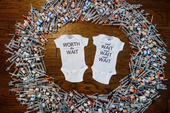 Según leemos en The Huffington Post, la pareja lleva prácticamente tres años detrás de un embarazo. Por eso, para celebrarlo, rodearon la ropita de los bebés con todas las jeringuillas y viales utilizados por el camino.