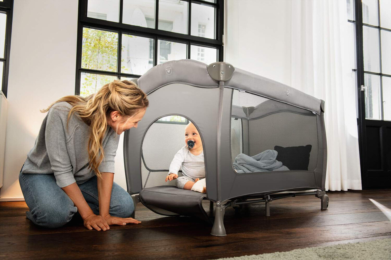 La cuna de viaje Dream'n Play Plus es un compañero práctico cuando se viaja o incluso en casa, ya que tiene una apertura por donde puede entrar o salir cuando quiera.