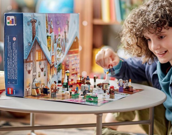 El calendario de adviento permite recrear escenas mágicas de las películas de Harry Potter. Cada una de las 24 puertas del calendario contiene un regalo mágico, que incluye 6 minifiguras LEGO: Harry Potter, Hermione Granger, Ron Weasley, Draco Malfoy y Señora Rosmerta, además de la primera minifigura de Aberforth Dumbledore. También incluye 18 mini-maquetas de lugares emblemáticos de Hogsmeade: La taberna de las Tres Escobas, el pub Cabeza de Puerco, la tienda de bromas de Zonko y la de golosinas Honeydukes, con 2 o 3 construcciones relacionadas y artículos navideños.
