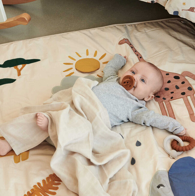 Esta alfombra estilo patchwork es un buen complemento para la habitación de los bebés. Brinda una superficie de juego cómoda para mantener a los bebés aislados del frío (la base tiene un efecto aislante) y cómodos mientras juegan. Se puede usar tanto en interiores y exteriores. Se puede meter en la lavadora y gracias al acolchado, el relleno se distribuye uniformemente incluso después de muchos lavados.