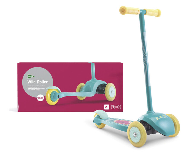 El patinete de iniciación Wild Roller está indicado para niños a partir de 2 años.Tiene dos ruedas delanteras que aportan mayor estabilidad y que, al entrar en movimiento, se encienden con luces de colores. Los puños son blanditos para que puedan agarrarse con toda seguridad. Además, incorpora el sistema "inclínate y gira", que hará la experiencia mucho más divertida.