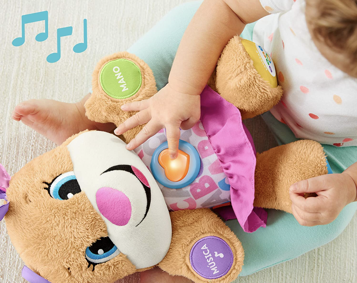 Perrita de peluche interactiva para bebés y niños de 6 a 36 meses. El peluche emite más de 75 canciones, melodías y frases de aprendizaje. Las manos, el pie, la oreja y el corazón luminoso responden al tacto del niño (incluye cinco puntos de activación).